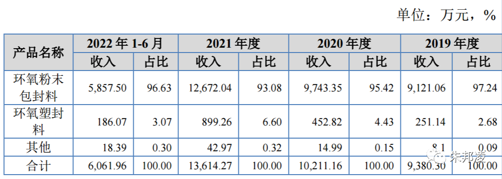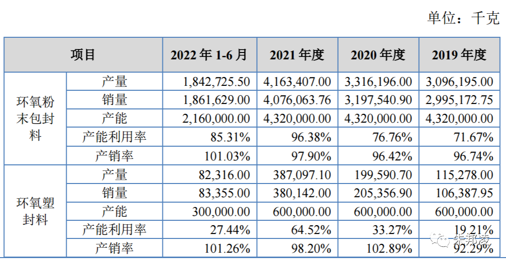 从产能利用角度来看,“以销定产”模式下,2019 年、2020 年公司环氧粉末包封料产能利用率分别为 71.67%与 76.76%,随着公司业务规模扩张,2021 年产能利用率达到 96.38%,逐渐趋于饱和。2019 年至 2021 年,公司环氧塑封料市场逐渐打开,产能利用率不断提高,总体呈现上升趋势。2022 年上半年,受疫情影响,公司主要产品产能利用率有所下降。