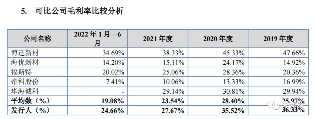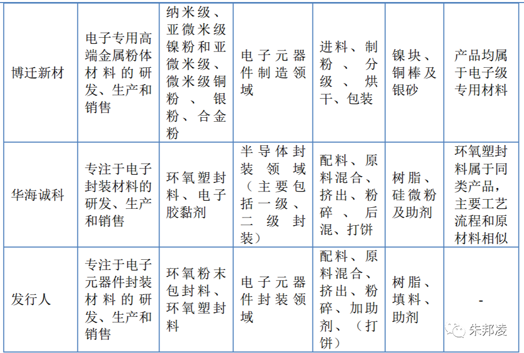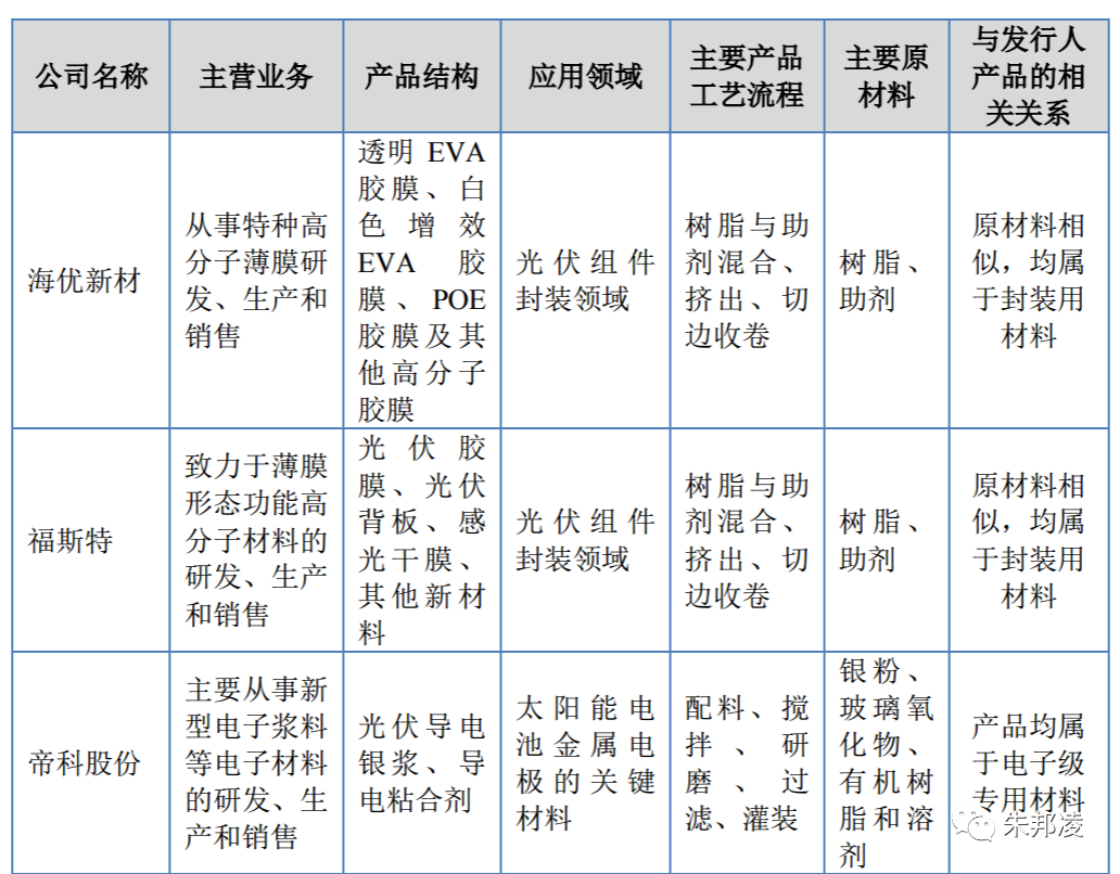 由于目前 A 股已上市公司中不存在与公司在产品结构与形态、下游细分应用领域、业务模式等方面完全一致的上市公司。除选取科创板在审企业华海诚科(A22153.SH)作为可比公司外,公司综合考虑在应用场景、产品功能、生产制造工艺、主要原材料以及行业壁垒等方面与公司具有相似性的公司后,选取了海优新材(688680.SH)、福斯特(603806.SH)、帝科股份(300842.SZ)、博迁新材(605376.SH)作为同行业可比公司。