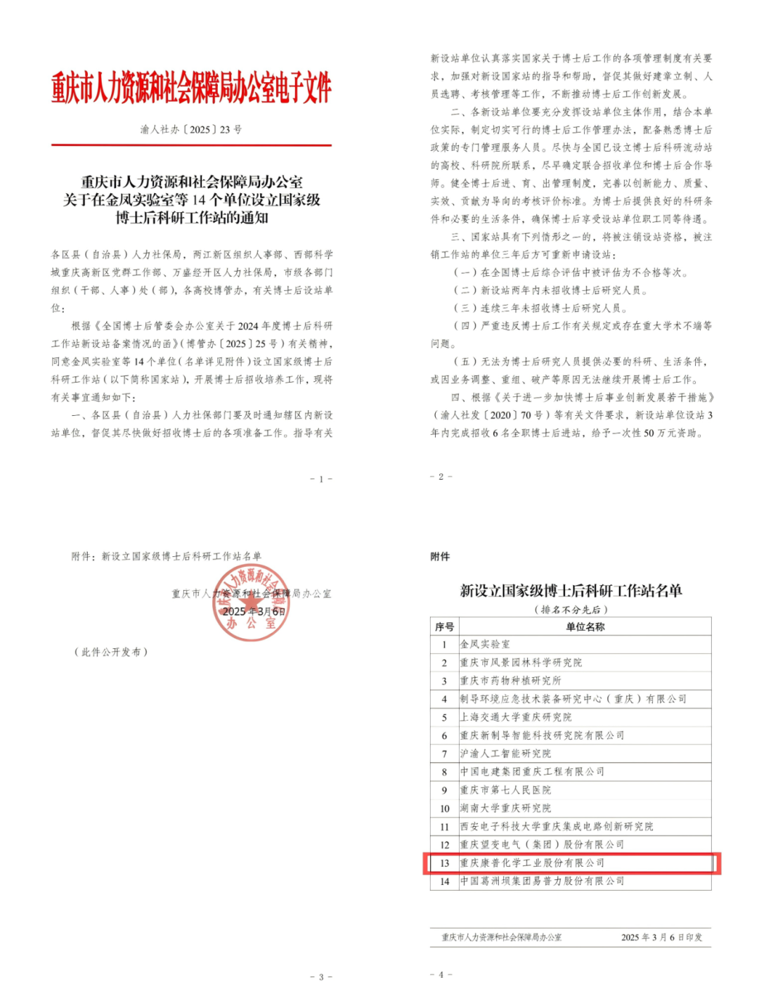 近日,经国家人力资源和社会保障部、全国博士后管委会办公室正式批准,康普化学成功获批设立国家级博士后科研工作站。这一殊荣标志着康普化学在高端人才引育、科研创新平台建设方面实现重大突破,成为重庆市新材料领域产学研深度融合的标杆企业。