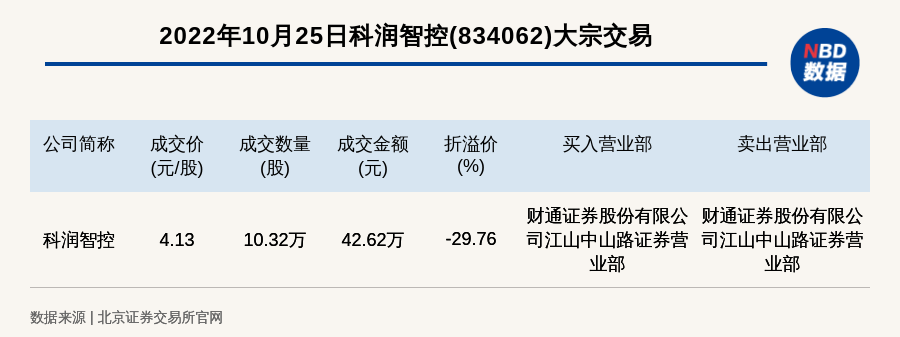 2022年10月25日,北交所上市公司科润智控(834062)发生一笔大宗交易,成交价4.13元/股,成交数量10.32万股,成交金额42.62万元,折价29.76%。买入营业部是财通证券股份有限公司江山中山路证券营业部,卖出营业部是财通证券股份有限公司江山中山路证券营业部。