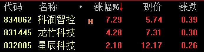 北交所133只个股中,今日有28只个股上涨,90只个股下跌,其中科润智控(BJ834062,股价5.74元,市值10亿元)、龙竹科技(BJ831445,股价7.31元,市值11亿元)涨幅靠前,分别上涨了7.29%、4.28%;下跌方面,格利尔(BJ831641,股价10.99元,市值8.1亿元)下跌了7.96%。