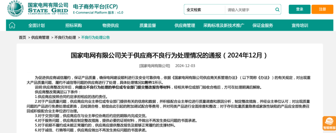 国家电网有限科润智控发布的通报显示,科润智控因箱式变电站产品在质量抽检中未能达标,触及了《国家电网供应商关系管理办法》中关于供应商不良行为的处理条款。因此,国家电网决定对其实施为期一年的禁投标处罚,具体涉及10(20)kV及以下箱式变电站,时间从2024年12月1日至2025年11月30日。国家电网强调,此次处罚旨在促使供应商履行合同义务、提升产品质量,确保电网建设的安全与可靠运行。