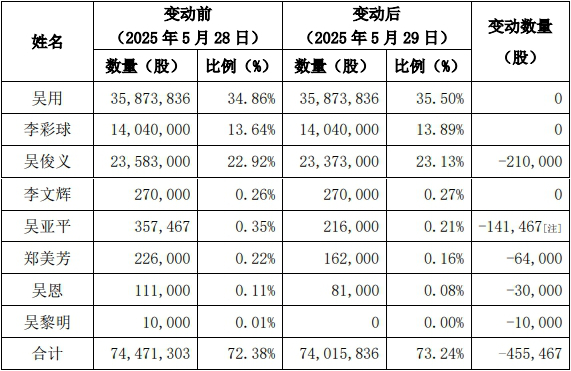 本次回购股份注销前,公司控股股东、实际控制人吴用、李彩球、吴俊义及其一致行动人李文辉、吴亚平、郑美芳、吴恩、吴黎明合计持有公司股份74,471,303股,注销完成后,合计持有公司股份74,015,836股,持股比例由72.38%增长至73.24%,权益变动触及1%的整数倍情形。