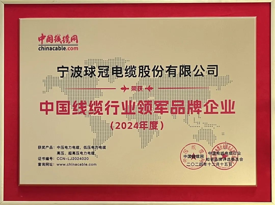 近日,由中国线缆网主办的“2024年线缆行业数智转型与创新发展大会暨中国线缆网会员大会”系列活动在山东济南盛大启幕。本次大会以“聚合生态?蝶变升维”为主题,汇聚了来自全国各地的线缆行业精英、专家学者及知名企业代表,共同见证线缆行业在数智化浪潮中的华丽蝶变与全新跨越。大会备受瞩目的“2024年线缆行业知名品牌颁奖典礼”也在当日隆重举行,球冠电缆凭借多年的创新发展、品牌优势荣获“2024年度中国线缆行业领军品牌企业”。