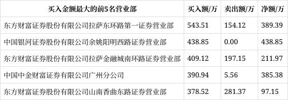 其中,东方财富证券股份有限公司拉萨东环路第一证券营业部、中国银河证券股份有限公司余姚阳明西路证券营业部、东方财富证券股份有限公司拉萨金融城南环路证券营业部分别买入543.51万元、438.85万元、409.12万元。