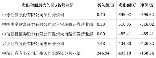 中原证券股份有限公司漯河分公司、中国中金财富证券有限公司北京宋庄路证券营业部、中信建投证券股份有限公司温州大南路证券营业部分别卖出595.92万元、516.35万元、485.41万元。