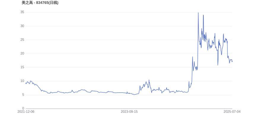 从上市首日至今,美之高的市值实现了0.87倍的增长。2025年1月2日,美之高的市值巅峰达到24.92亿元,股价也顺应升至35.8元。而至7月4日收盘,美之高的股价为17.13元,市值为15.36亿元,相比峰值时期市值减少9.56亿元,市值蒸发了38.36%。