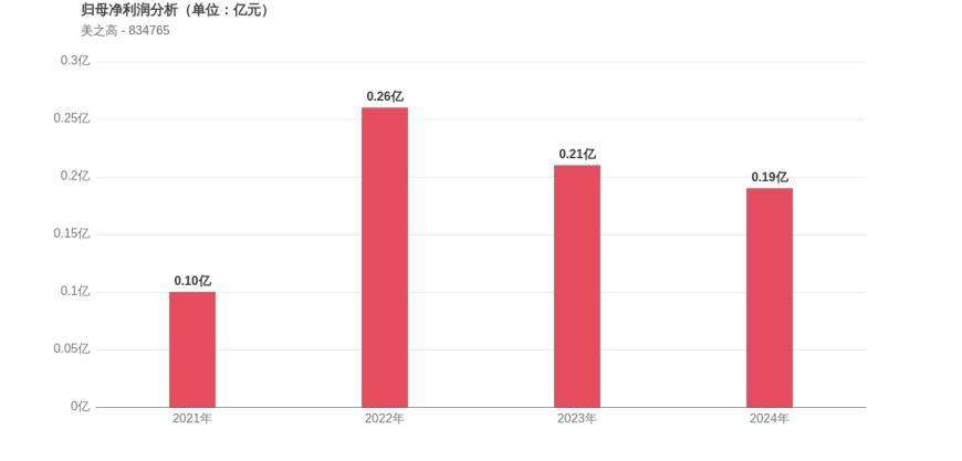 利润角度分析,2021年美之高实现归母净利润0.10亿元,2024年0.19亿元。利润水平在经历波动后实现近一倍增长。