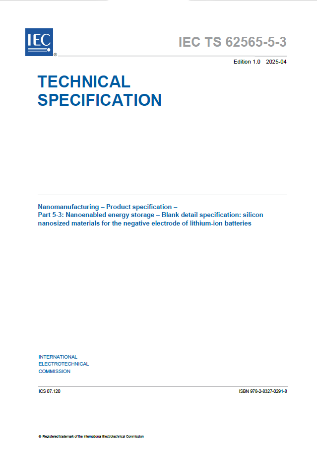 近日,由贝特瑞联合国家纳米科学中心、深圳市标准技术研究院等单位制定的国际标准IEC TS 62565-5-3:2025 《锂离子电池用纳米硅负极材料空白详细规范》正式发布。该标准是硅基负极材料领域首项国际标准,由中国、加拿大、德国、意大利的多位专家起草,规定了锂电池负极用纳米硅负极材料的空白详细规范和格式,列出了多项关键控制特性,并规定相应测量方法,为纳米硅负极材料的生产和质量控制提供了重要参考,同时为产业链上下游的协同创新提供了技术支撑。