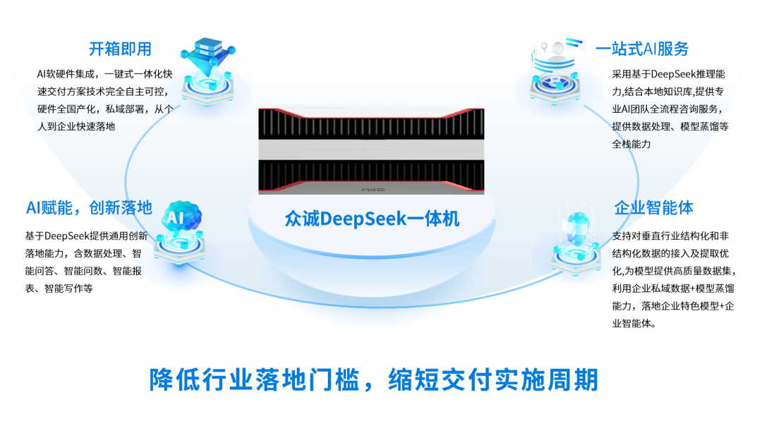 在众诚科技展厅,庄市长一行特别关注了众诚科技新推出的DeepSeek一体化解决方案及国产化AI一体机,这一创新产品可实现对算力支持、训练推理与应用开发全流程服务的整合,适配DeepSeek V3/R1及蒸馏模型,打造“开箱即用”的私域AI全栈能力,为智能制造、政务服务等领域提供智能化转型支撑。庄市长对此给予了肯定,并鼓励众诚加快技术成果向产业端转化,赋能传统产业智能化升级。
