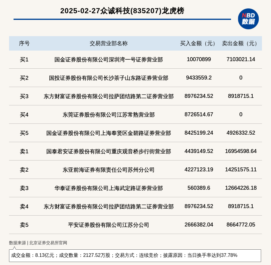 每经讯,2025年2月27日,北交所上市公司众诚科技(835207,收盘价:40.6元)登上龙虎榜,交易方式是连续竞价,披露原因是当日换手率达到37.78%,成交数量2127.52万股,成交金额8.13亿元。买一席位为国金证券股份有限公司深圳湾一号证券营业部,买入1007.09万元;卖一席位为国泰君安证券股份有限公司重庆观音桥步行街营业部,卖出1695.46万元。