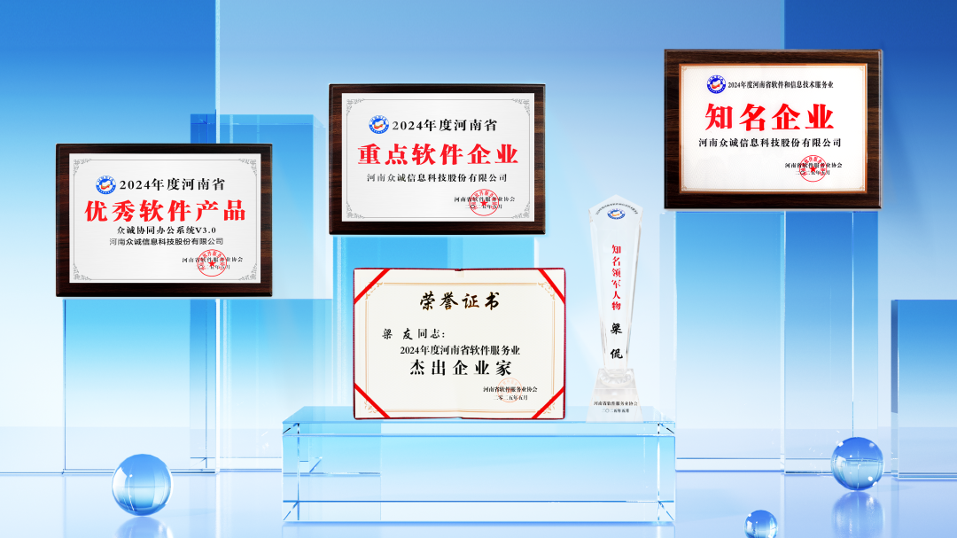 会上,众诚科技自研软件产品“众诚协同办公系统V3.0”,凭借其卓越性能和创新价值,荣膺“2024年度河南省优秀软件产品”称号,公司也荣获“2024河南省重点软件企业”权威认定。同时,众诚科技董事长梁侃荣登“河南省软件和信息技术服务业知名领军人物”榜单,总经理梁友荣获“2024年度河南省软件服务业杰出企业家”证书,领袖风采卓然。
