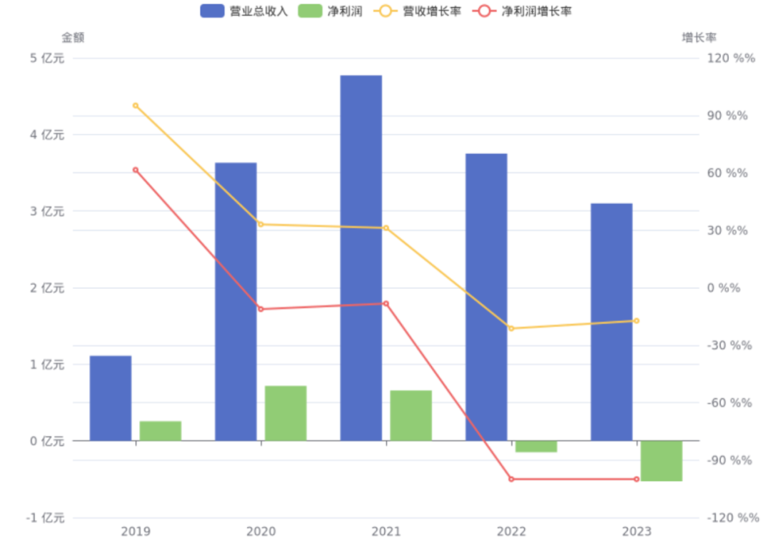 而近期发布的2023年年度业绩快报,进一步揭示了公司的财务压力。数据显示,2023年全年的营业收入为3.1亿元,同比减少了17.31%,归属于母公司股东的净利润亏损额急剧扩大至5279.29万元,相较上年同期的亏损增加了近3800万元。