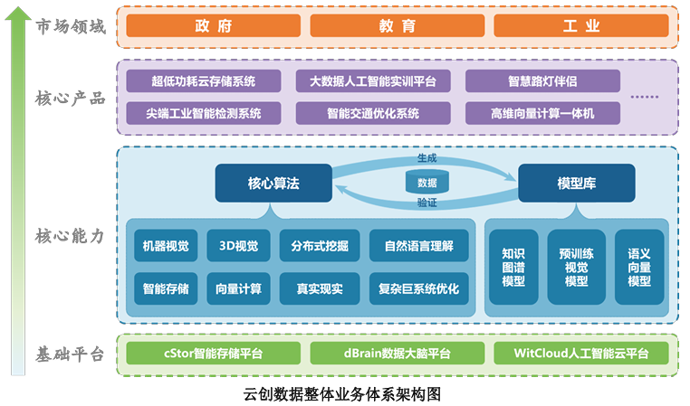 从技术壁垒来看,近年针对爆炸式增长的大数据人工智能需求,云创数据研发了具有自主知识产权的“智能存储平台”、“大数据处理平台”和“人工智能云平台”三大平台,并在此基础上以算法生成模型,由模型验证算法,研发出可以不断自我优化的“核心算法+模型库”智能成长模式,作为企业技术核心能力。最终,构建出具有特色和竞争力的核心产品体系,面向不同市场领域客户提供完整的大数据存储与智能处理解决方案,形成了自底而上的大数据人工智能全产业链架构。