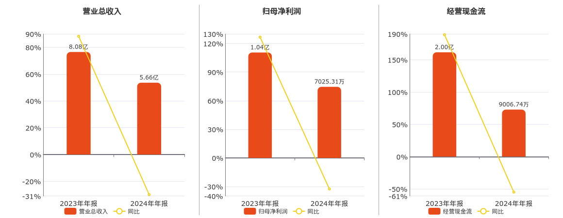 公司营业总收入为5.66亿元,较去年同报告期营业总收入减少2.42亿元,同比较去年同期下降29.95%。归母净利润为7025.31万元,较去年同报告期归母净利润减少3395.82万元,同比较去年同期下降32.59%。经营活动现金净流入为9006.74万元,较去年同报告期经营活动现金净流入减少1.10亿元,同比较去年同期下降54.93%。