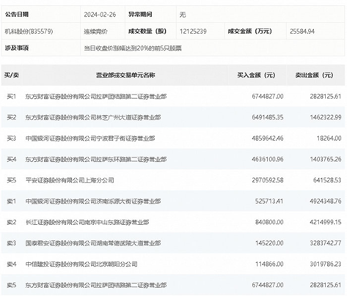 2月26日,机科股份今日涨22.39%,龙虎榜数据显示,上榜营业部席位全天成交4912.61万元,占当日总成交金额比例为19.2%。其中,买入金额为2732.92万元,卖出金额为2179.69万元,合计净买入553.24万元。