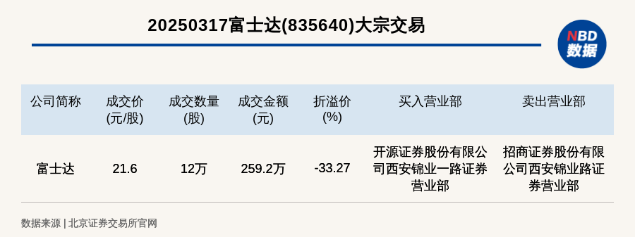2025年3月17日,北交所上市公司富士达(835640,收盘价:32.37元)发生一笔大宗交易,成交价21.6元/股,成交数量12万股,成交金额259.2万元,折价33.27%。买入营业部是开源证券股份有限公司西安锦业一路证券营业部,卖出营业部是招商证券股份有限公司西安锦业路证券营业部。