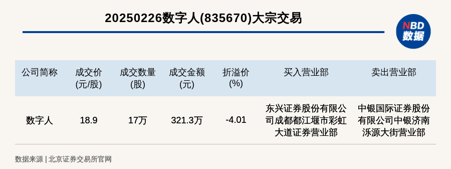 2025年2月26日,北交所上市公司数字人(835670,收盘价:19.69元)发生一笔大宗交易,成交价18.9元/股,成交数量17万股,成交金额321.3万元,折价4.01%。买入营业部是东兴证券股份有限公司成都都江堰市彩虹大道证券营业部,卖出营业部是中银国际证券股份有限公司中银济南泺源大街营业部。