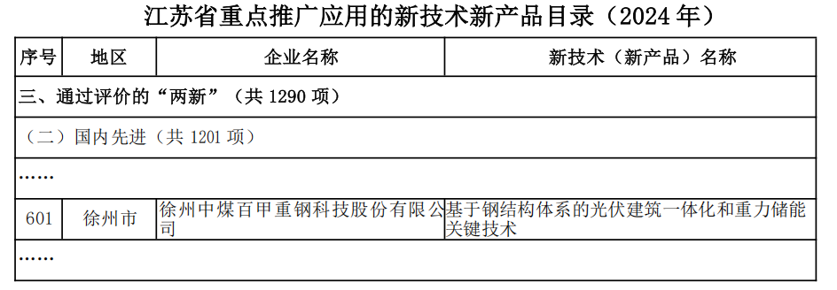 近日,江苏省工业和信息化厅印发了《江苏省重点推广应用的新技术新产品目录(2024年)》(以下简称《目录》),徐州中煤百甲重钢科技股份有限公司(简称:百甲科技股票代码:835857)“基于钢结构体系的光伏建筑一体化和重力储能关键技术”入选省“两新”目录,类别:国内先进。