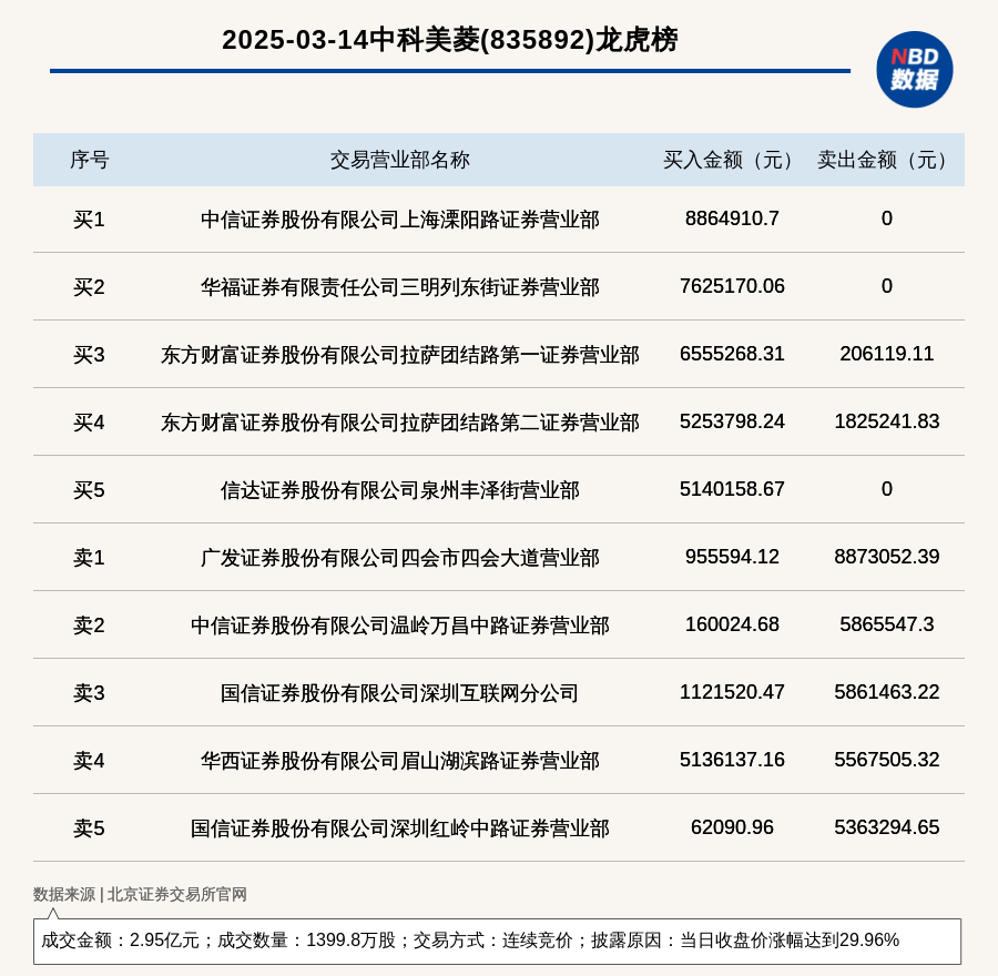 2025年3月14日,北交所上市公司中科美菱(835892,收盘价:23.34元)登上龙虎榜,交易方式是连续竞价,披露原因是当日收盘价涨幅达到29.96%,成交数量1399.8万股,成交金额2.95亿元。买一席位为中信证券股份有限公司上海溧阳路证券营业部,买入886.49万元;卖一席位为广发证券股份有限公司四会市四会大道营业部,卖出887.31万元。
