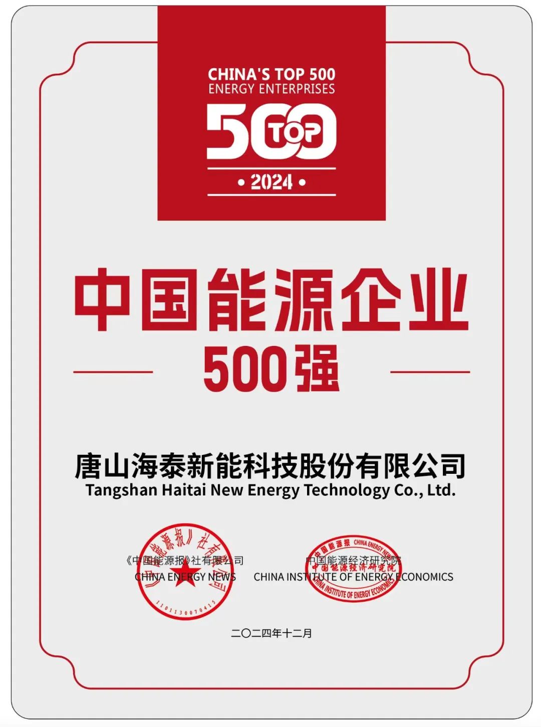 近日,中国能源报发布2024中国能源企业500强榜单,评选采用国际通用评价方式,以能源企业上一年度营业收入为评价标准。海泰新能此次入选,是公司在能源领域取得成绩的有力证明,体现了公司在技术创新、产品质量等方面的综合实力。