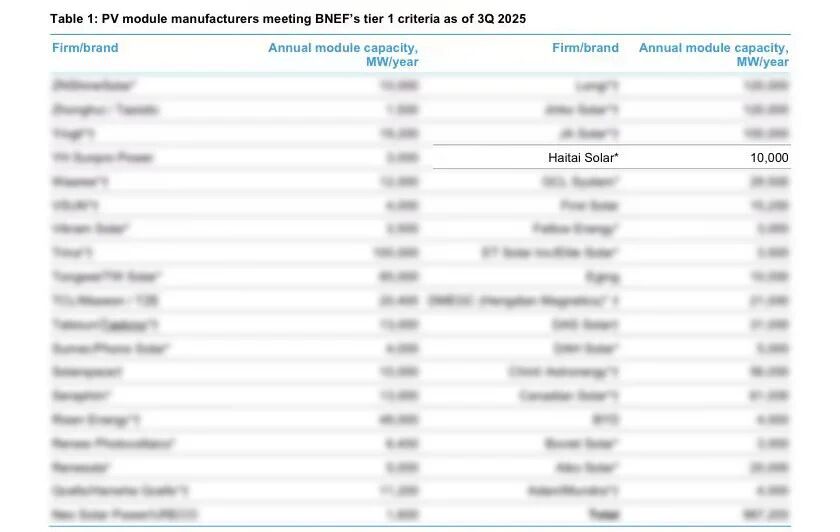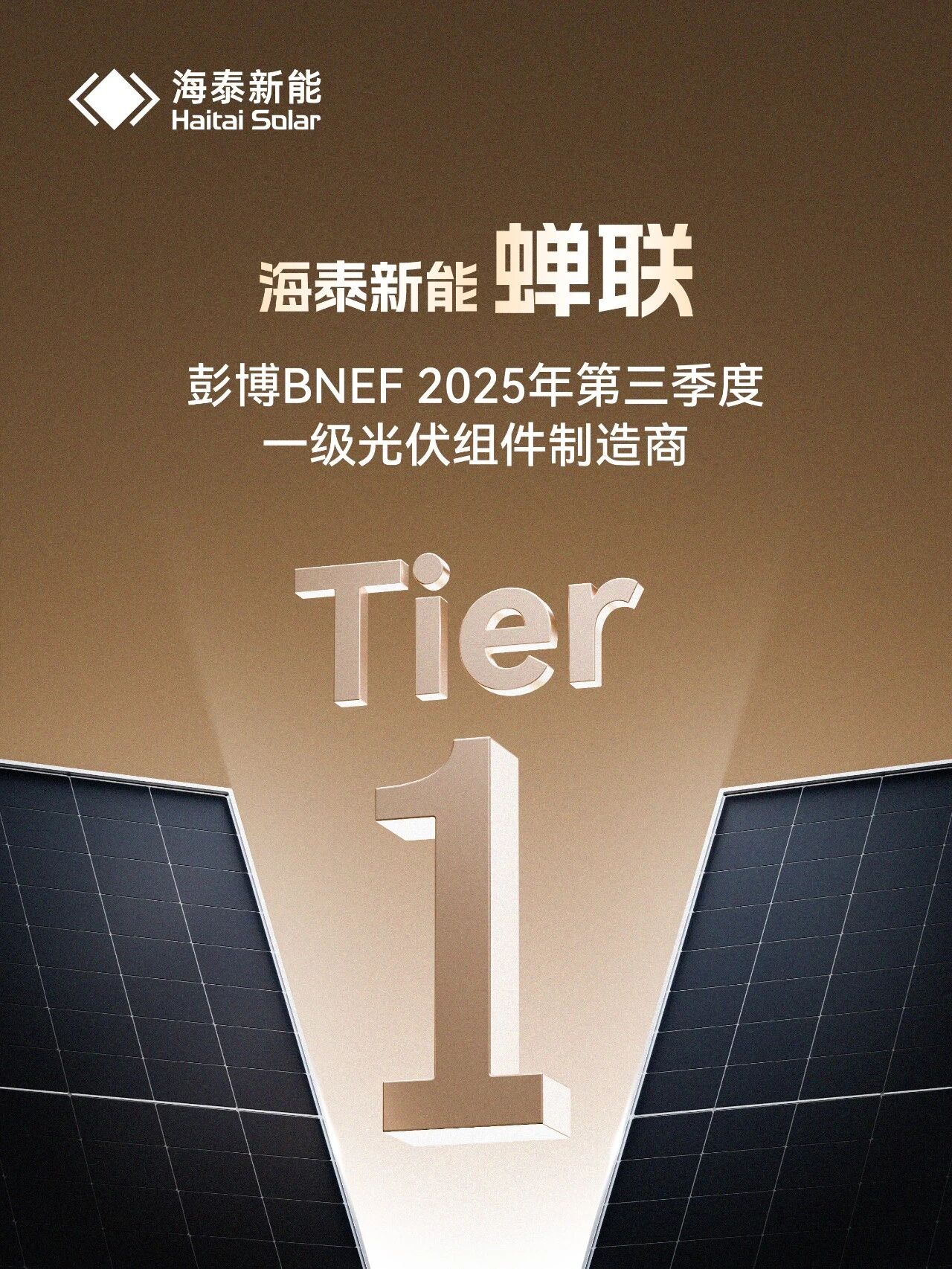 近日,全球知名研究机构彭博新能源财经(BloombergNEF,简称BNEF)公布了2025年第三季度Tier 1全球一级光伏组件制造商榜单,海泰新能凭借综合实力再次上榜。
