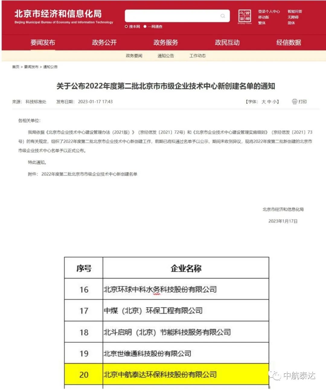 2023年1月17日,根据北京市经济和信息化局发布《关于公布2022年度第二批北京市市级企业技术中心新创建名单的通知》,北京中航泰达环保科技股份有限公司(以下简称“公司”)被认定为“北京市市级企业技术中心”。