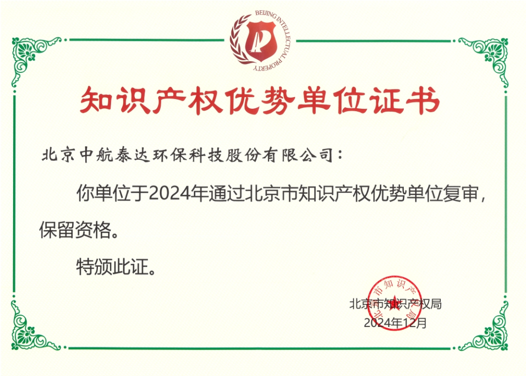 近日,北京中航泰达环保科技股份有限公司(以下简称“中航泰达”)成功通过北京市知识产权优势单位的复审,再次证明了其在知识产权管理和创新方面的卓越实力。