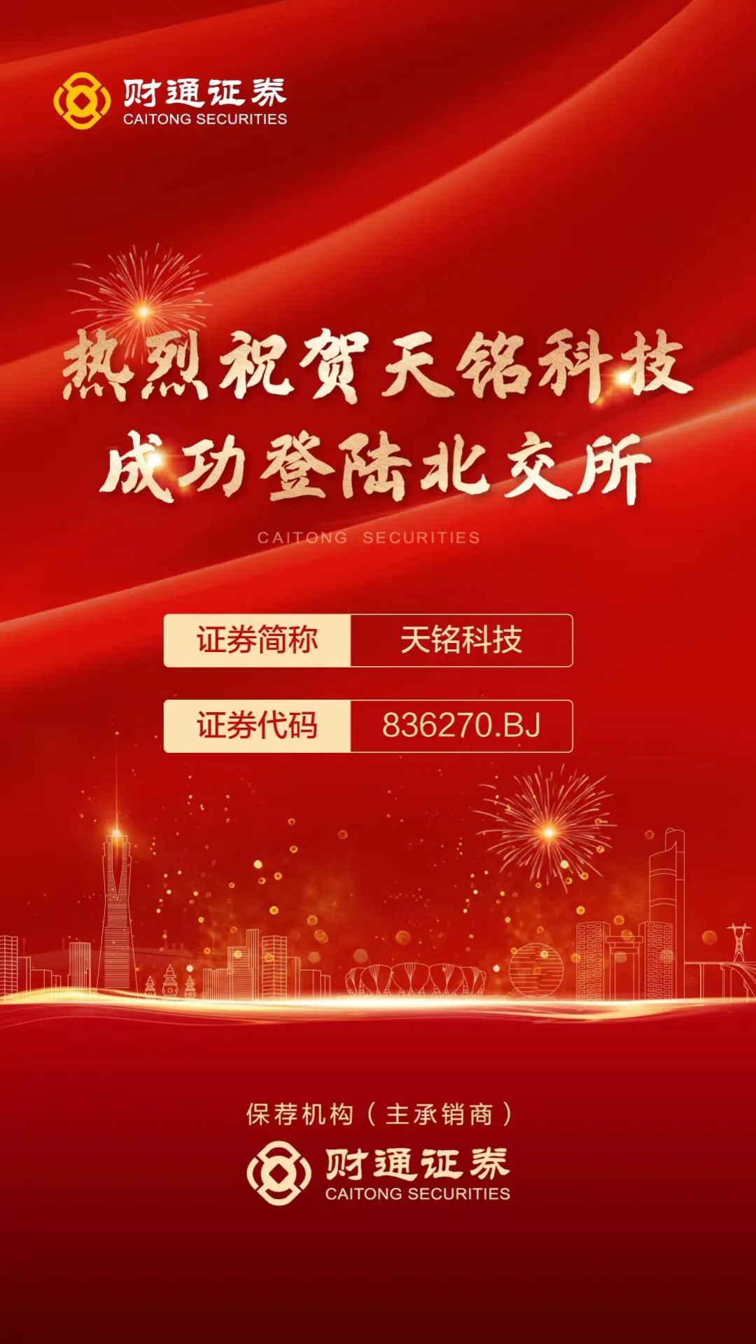 章启诚对天铭科技成功上市致以诚挚祝贺。他表示,天铭科技成功登陆北交所,是企业发展的重要里程碑,也是全新的发展起点。相信依托北交所的资本平台,天铭科技必将在创新发展的征途中取得新的辉煌,财通证券也将认真履行持续督导责任,助力企业持续健康发展。未来,我们将继续聚焦聚力“专精特新”这片新蓝海、新赛道,深化在服务专精特新企业高质量发展方面的优势与能力,助力更多优秀企业成功登陆资本市场。