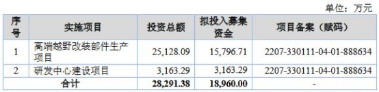 天铭科技本次公开发行股票募集资金扣除发行费用后的募集资金净额将全部用于高端越野改装部件生产项目、研发中心建设项目。