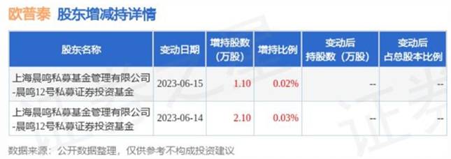 欧普泰6月16日披露的权益变动报告书显示,晨鸣(青岛)资产管理有限公司(以下简称:晨鸣或公司)及其一致行动人旗下的1只私募基金产品分别于6月14日、6月15日通过集中竞价方式进行了增持,总计增持股份达3.2万股,增持比例为0.0480%。截至2023年6月20日,晨鸣(青岛)资产管理有限公司持有上市公司股份数量为334.51万股,持股比例为5.0171%。