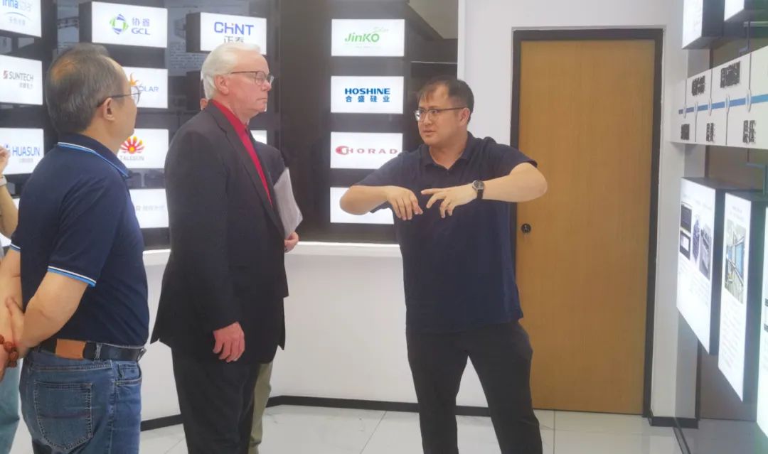 Ed Rogers一行首先参观了欧普泰展厅,深入了解欧普泰的发展历程、业务模块、技术成果、市场规模等,对欧普泰构建涵盖组件生产前后工序全链AI检测、光伏电站EL全检服务、基于真实组串电路分布的全场景数字孪生模型技术的光伏电站运维系统给予高度评价,对欧普泰深耕光伏行业十余年间的专业积累与内涵积淀给予充分认可。