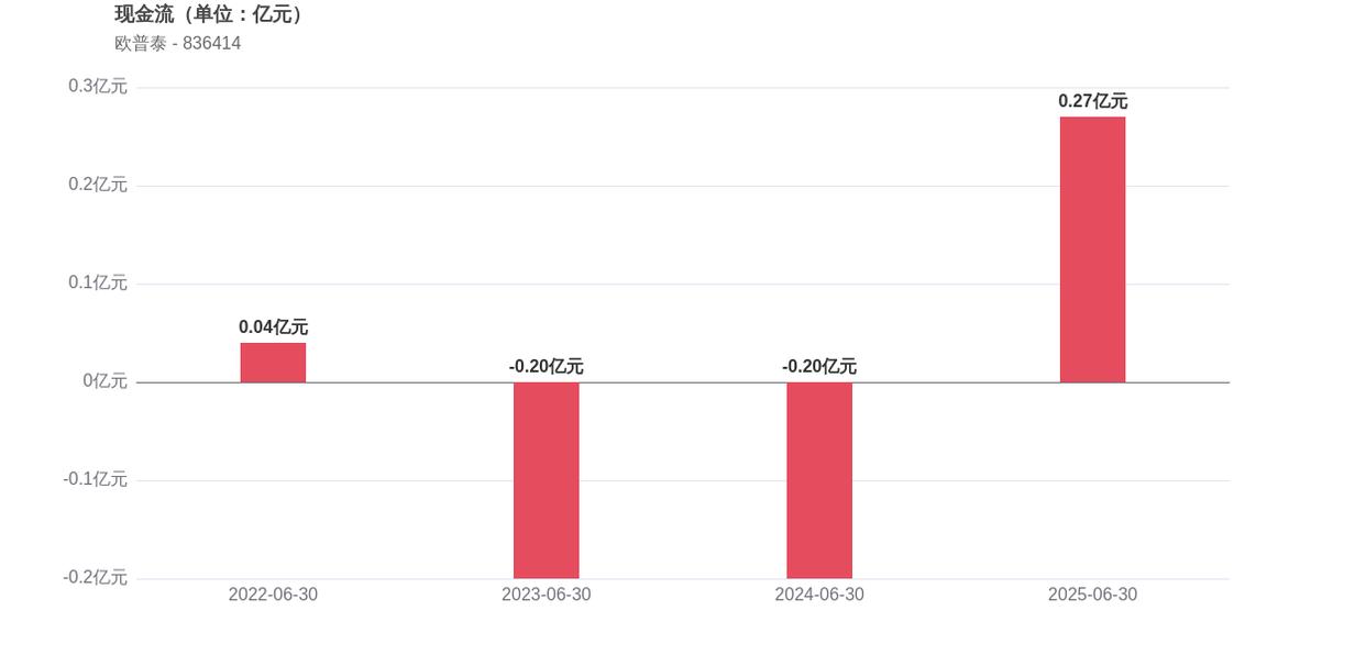 在经营稳健性方面,欧普泰面临存货管理效率提升的积极变化,存货周转天数为130.95天,较2024年上半年下降了45.97%,表明库存管理能力有所改善。经营活动产生的现金流净额0.27亿元,相比2024年同期的-0.2亿元实现了由负转正,显示出现金流状况的好转。此外,2025年上半年的资产负债率27.37%,同比增长了11.76个百分点,这意味着企业负债水平有所上升。