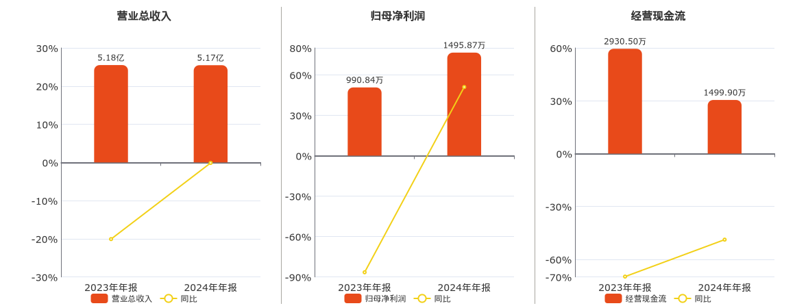 公司营业总收入为5.17亿元,较去年同报告期营业总收入减少66.08万元,同比较去年同期下降0.13%。归母净利润为1495.87万元。经营活动现金净流入为1499.90万元,较去年同报告期经营活动现金净流入减少1430.61万元,同比较去年同期下降48.82%。