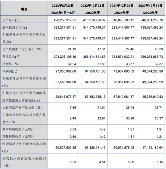 2020年至2023年1月-6月,无锡晶海营业收入分别为2.66亿元、3.84亿元、3.87亿元、2.03亿元,净利润分别为4937.43万元、7395.71万元、6435.01万元、2765.59万元,归属于母公司所有者的净利润分别为4937.43万元、7395.71万元、6435.01万元、2765.59万元,归属于母公司所有者的扣除非经常性损益后的净利润分别为4535.66万元、6754.01万元、6738.38万元、2984.60万元。