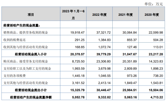 2020年至2023年1月-6月,无锡晶海销售商品、提供劳务收到的现金分别为22,599.98万元、30,064.84万元、37,321.72万元、19,918.47万元,经营活动产生的现金流量净额分别为4,713.22万元、5,063.16万元、9,332.82万元、5,052.78万元。