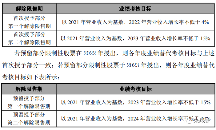 首次授予部分第一个解除限售期以 2021 年营业收入为基数,2022 年营业收入增长率不低于 4%首次授予部分第二个解除限售期以 2021 年营业收入为基数,2023 年营业收入增长率不低于 15%。