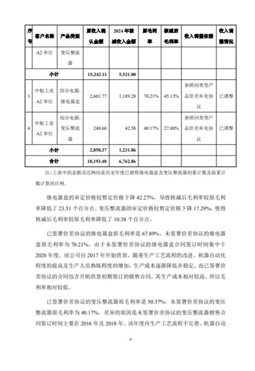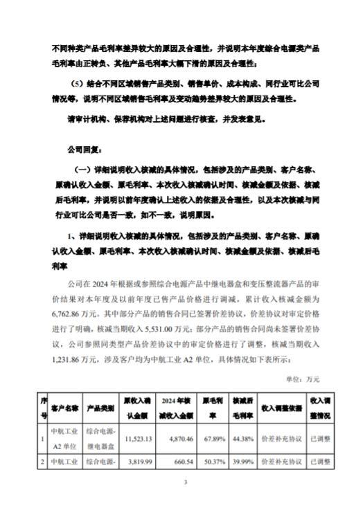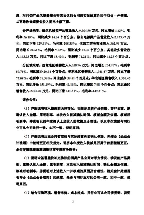 北交所问询函指出,晟楠科技2024年营业收入7,431.75万元,同比下降55.94%;净利润亏损979.76万元,毛利率跌至9.99%。公司解释称,主要因与中航工业A2单位签署价差补充协议,核减历史合同暂定价与实际结算价差额,并对未签署协议的同类产品参照平均价调减收入,合计影响6,762.86万元。其中,继电器盒与变压整流器两类产品占核减金额的91.8%。北交所要求详细说明收入核减的具体情况,并说明以前年度确认上述收入的依据及合理性。