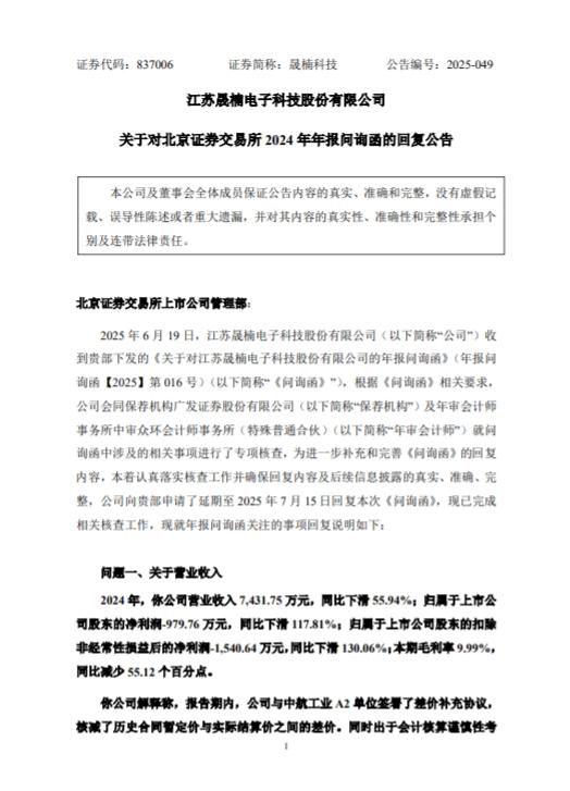 7月15日,江苏晟楠电子科技股份有限公司(下称“晟楠科技”,证券代码:837006)发布对北京证券交易所2024年年报问询函的回复公告,详细解释了营收骤降、净利转负、应收账款高企等关键问题。