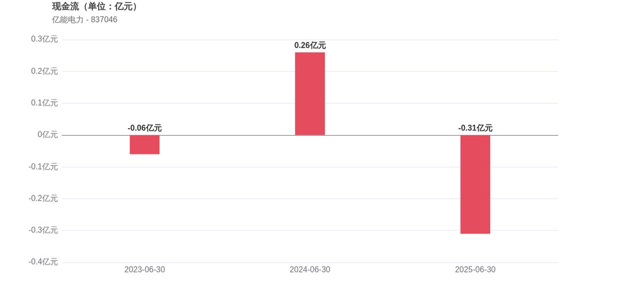 在经营稳健性方面,亿能电力面临现金流承压的挑战,存货周转天数为115.50天,较去年同期下降6.8%,显示出运营效率有所改善。经营活动产生的现金流净额为-0.31亿元,相比2024年同期的0.26亿元由正转负,显示出经营现金流状况恶化。此外,2025年上半年的资产负债率为40.01%,同比增长4.50个百分点,这意味着公司债务负担有所加重。