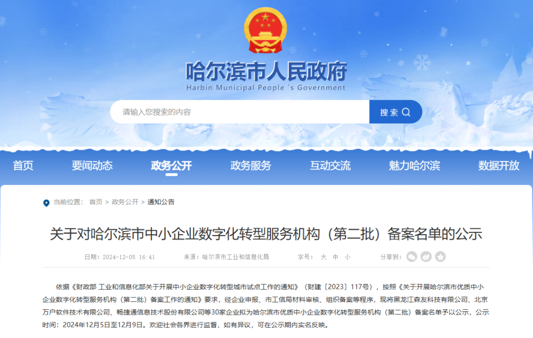 近日,哈尔滨市工业和信息化局正式公示了《关于对哈尔滨市中小企业数字化转型服务机构(第二批)备案名单》。经过企业申报、工信局审核、组织备案等程序,山东汉鑫科技股份有限公司成功入选。