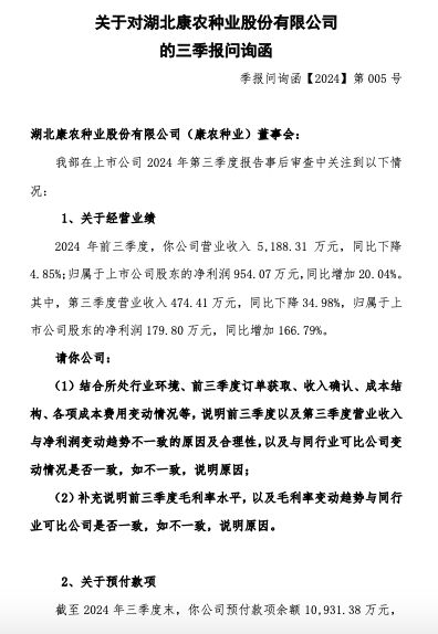 11月26日,北京证券交易所下发关于对湖北康农种业股份有限公司(以下简称“康农种业”或“公司”)的三季报问询函。北交所要求康农种业说明前三季度以及第三季度营业收入与净利润变动趋势不一致的原因及合理性,以及与同行业可比公司变动情况是否一致;说明本期末预付款项较期初及去年同期大幅增加的原因及合理性,并结合期后到货情况说明目前预付款项结转进度,是否存在预付款项长期挂账风险等。