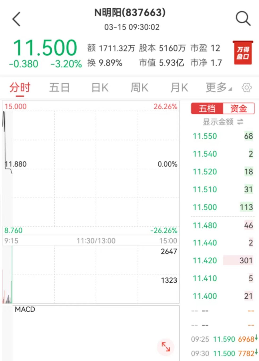3月15日,明阳科技登陆北交所,截至9:30,N明阳(837663)下跌3.20%,现报11.5元,成交额为1711.32万元,总市值为5.93亿元。
