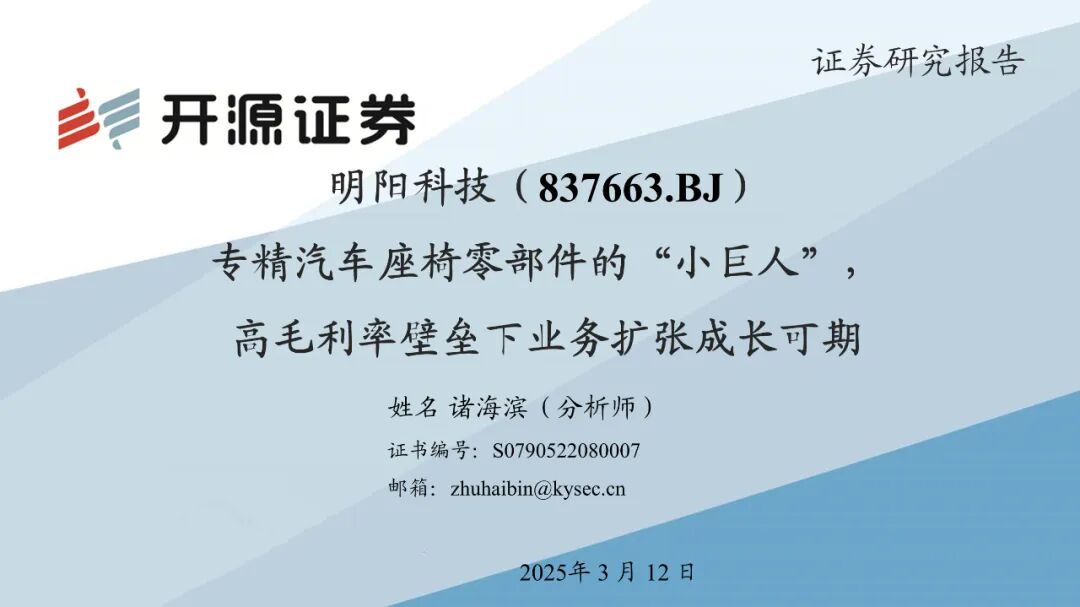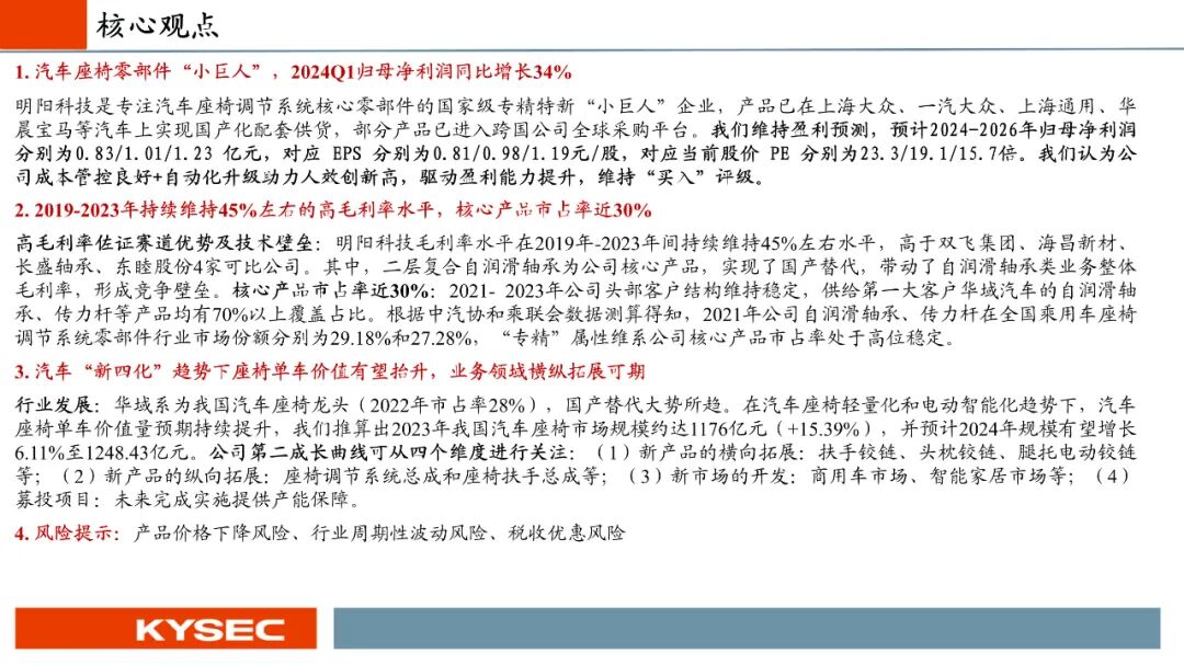 明阳科技是专注汽车座椅调节系统核心零部件的国家级专精特新“小巨人”企业,产品已在上海大众、一汽大众、上海通用、华晨宝马等汽车上实现国产化配套供货,部分产品已进入跨国公司全球采购平台。我们维持盈利预测,预计2024-2026年归母净利润分别为0.83/1.01/1.23 亿元,对应 EPS 分别为0.81/0.98/1.19元/股,对应当前股价 PE 分别为23.3/19.1/15.7倍。我们认为公司成本管控良好+自动化升级助力人效创新高,驱动盈利能力提升,维持“买入”评级。