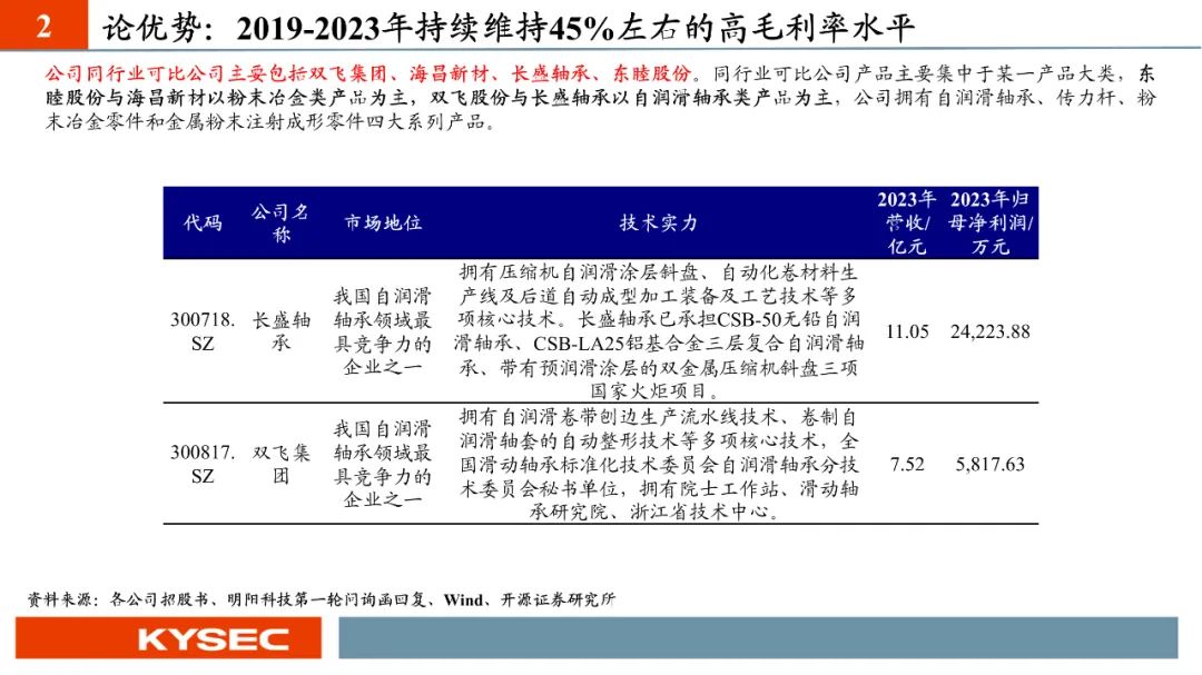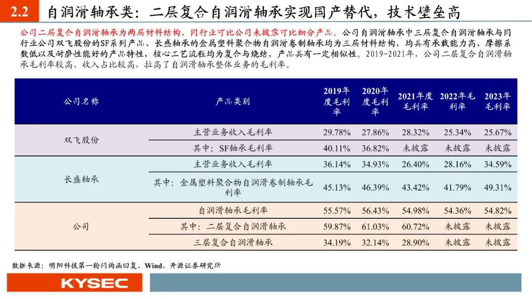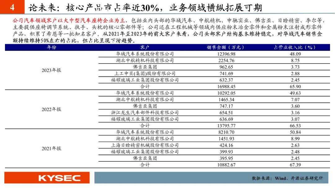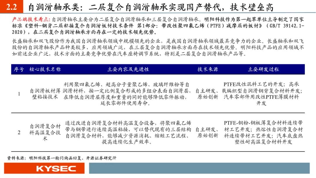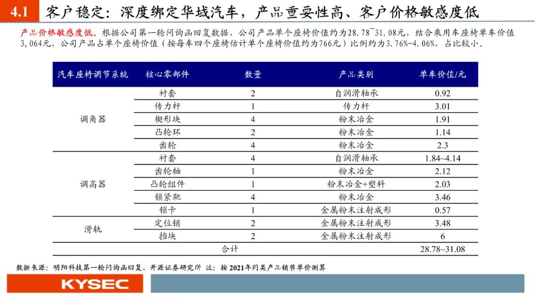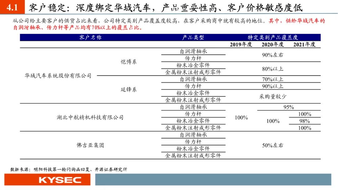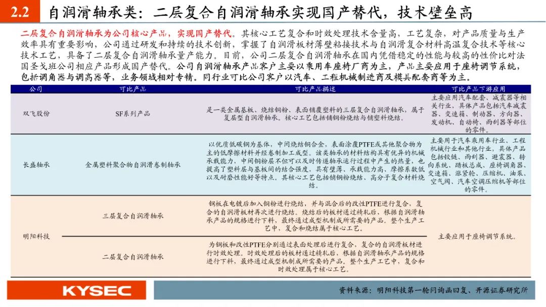 高毛利率佐证赛道优势及技术壁垒:明阳科技毛利率水平在2019年-2023年间持续维持45%左右水平,高于双飞集团、海昌新材、长盛轴承、东睦股份4家可比公司。其中,二层复合自润滑轴承为公司核心产品,实现了国产替代,带动了自润滑轴承类业务整体毛利率,形成竞争壁垒。核心产品市占率近30%:2021- 2023年公司头部客户结构维持稳定,供给第一大客户华域汽车的自润滑轴承、传力杆等产品均有70%以上覆盖占比。根据中汽协和乘联会数据测算得知,2021年公司自润滑轴承、传力杆在全国乘用车座椅调节系统零部件行业市场份额分别为29.18%和27.28%,“专精”属性维系公司核心产品市占率处于高位稳定。