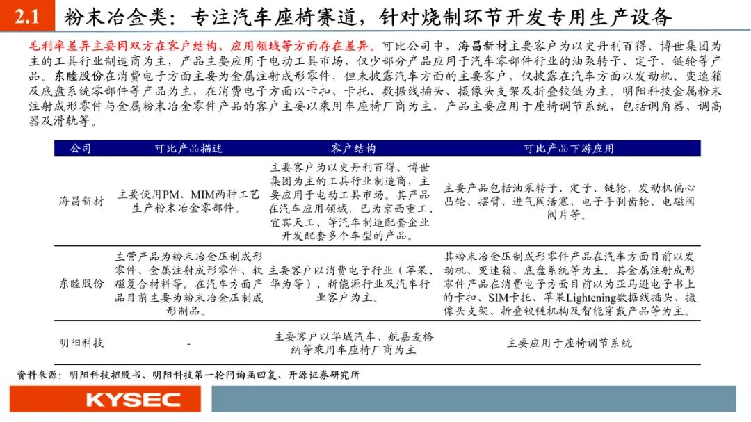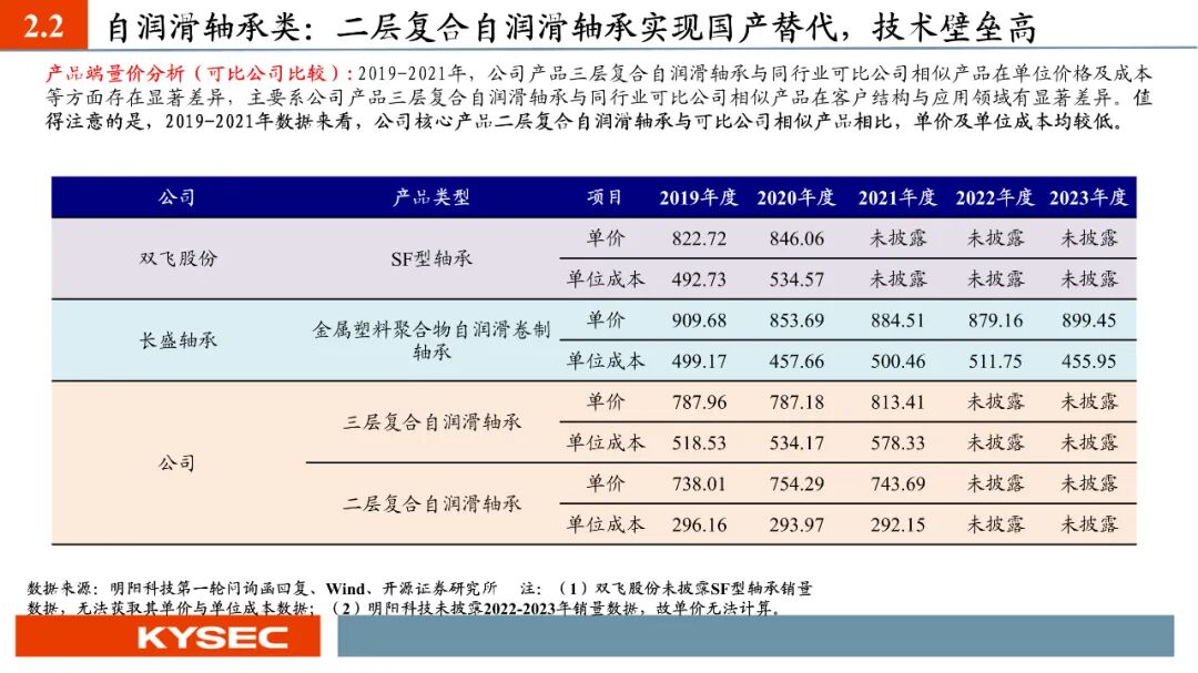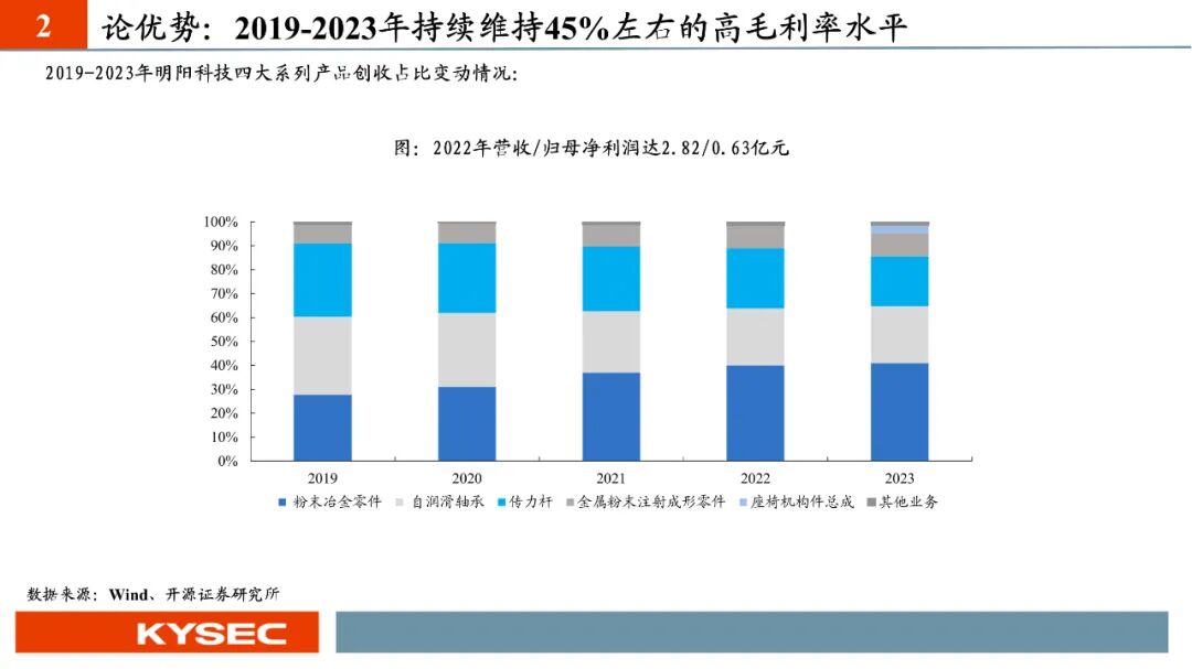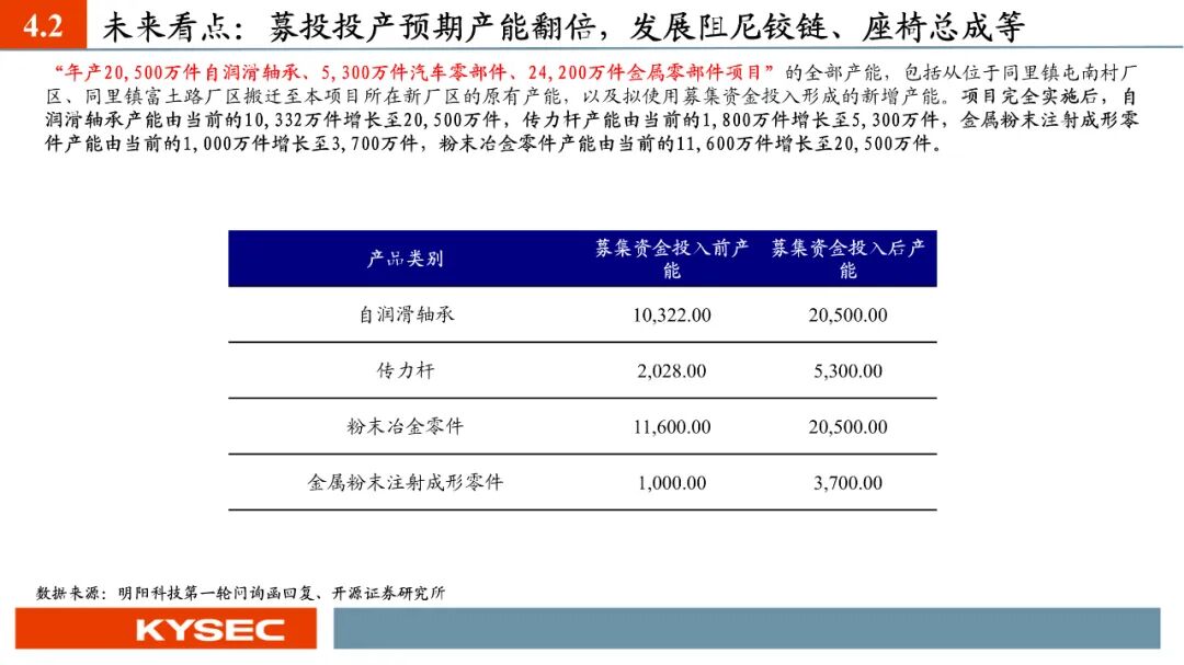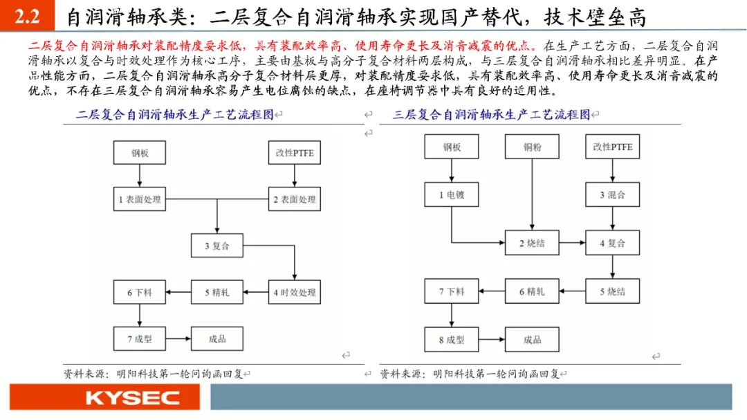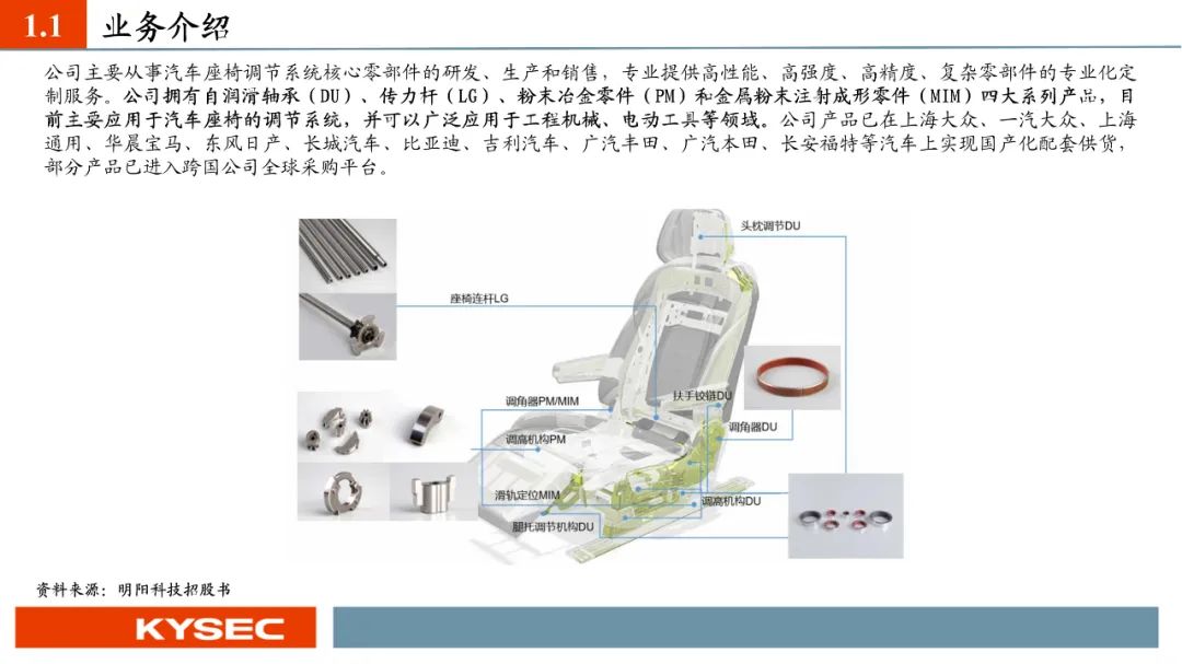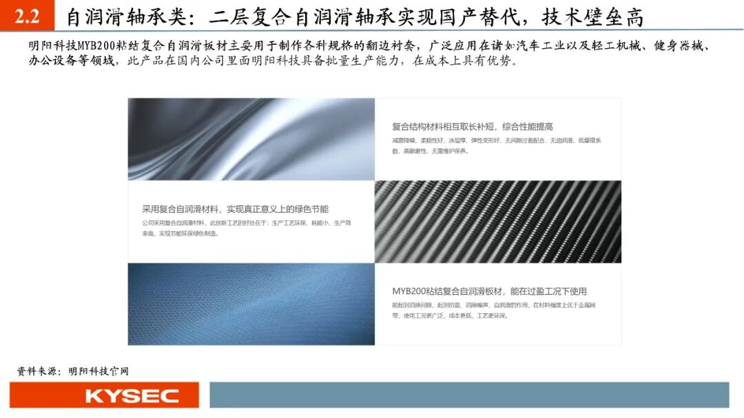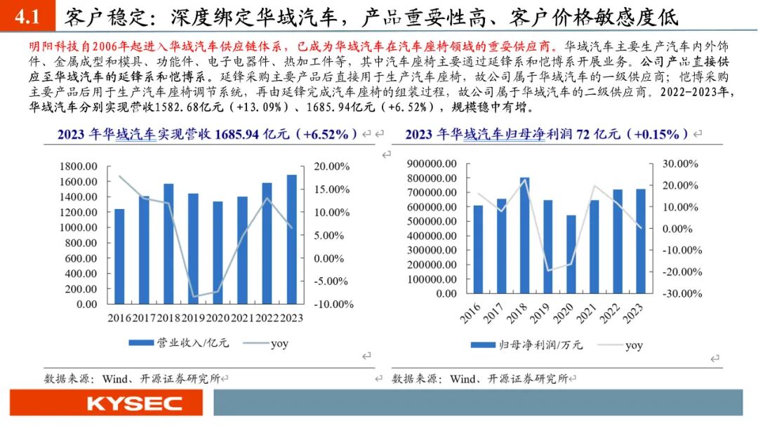 高毛利率佐证赛道优势及技术壁垒:明阳科技毛利率水平在2019年-2023年间持续维持45%左右水平,高于双飞集团、海昌新材、长盛轴承、东睦股份4家可比公司。其中,二层复合自润滑轴承为公司核心产品,实现了国产替代,带动了自润滑轴承类业务整体毛利率,形成竞争壁垒。核心产品市占率近30%:2021- 2023年公司头部客户结构维持稳定,供给第一大客户华域汽车的自润滑轴承、传力杆等产品均有70%以上覆盖占比。根据中汽协和乘联会数据测算得知,2021年公司自润滑轴承、传力杆在全国乘用车座椅调节系统零部件行业市场份额分别为29.18%和27.28%,“专精”属性维系公司核心产品市占率处于高位稳定。
