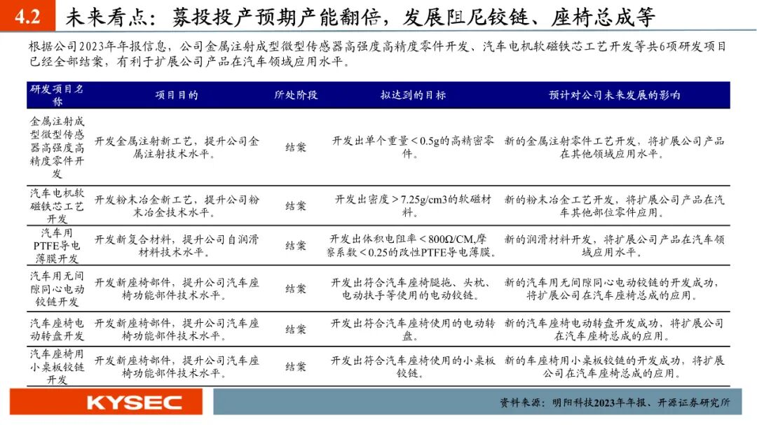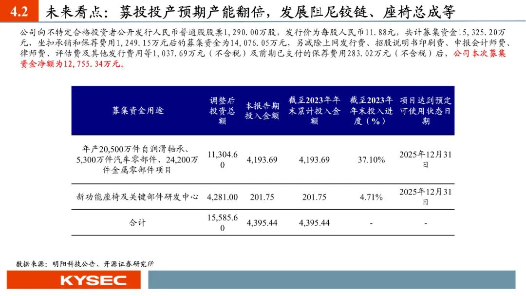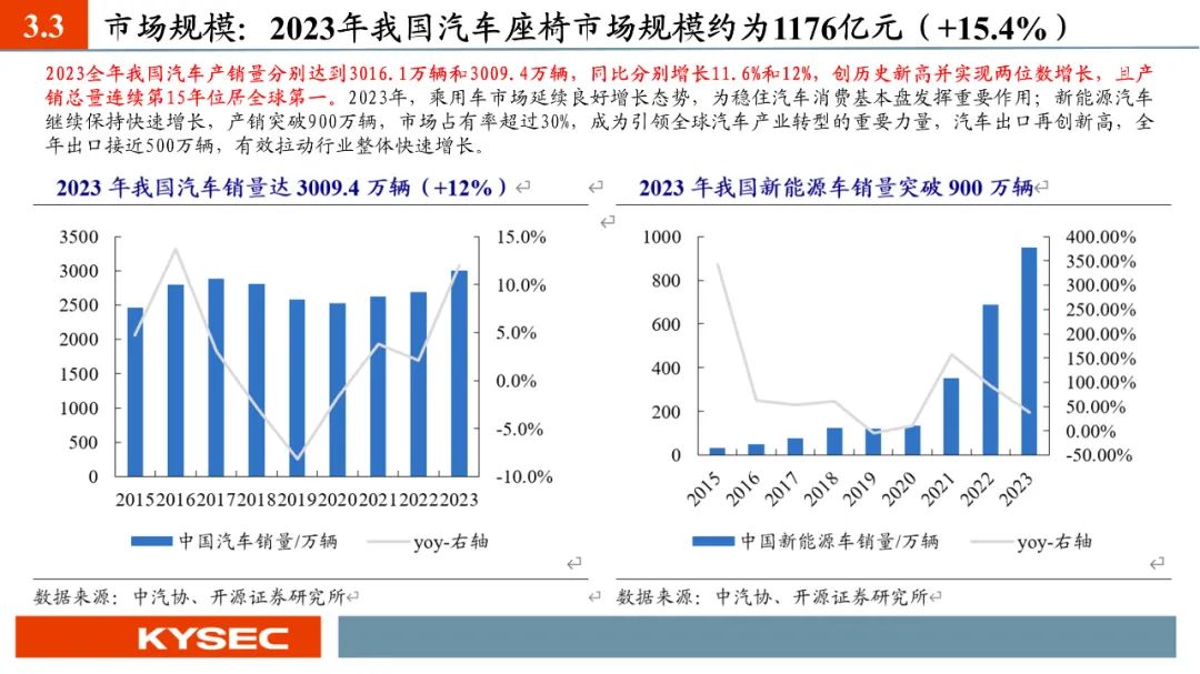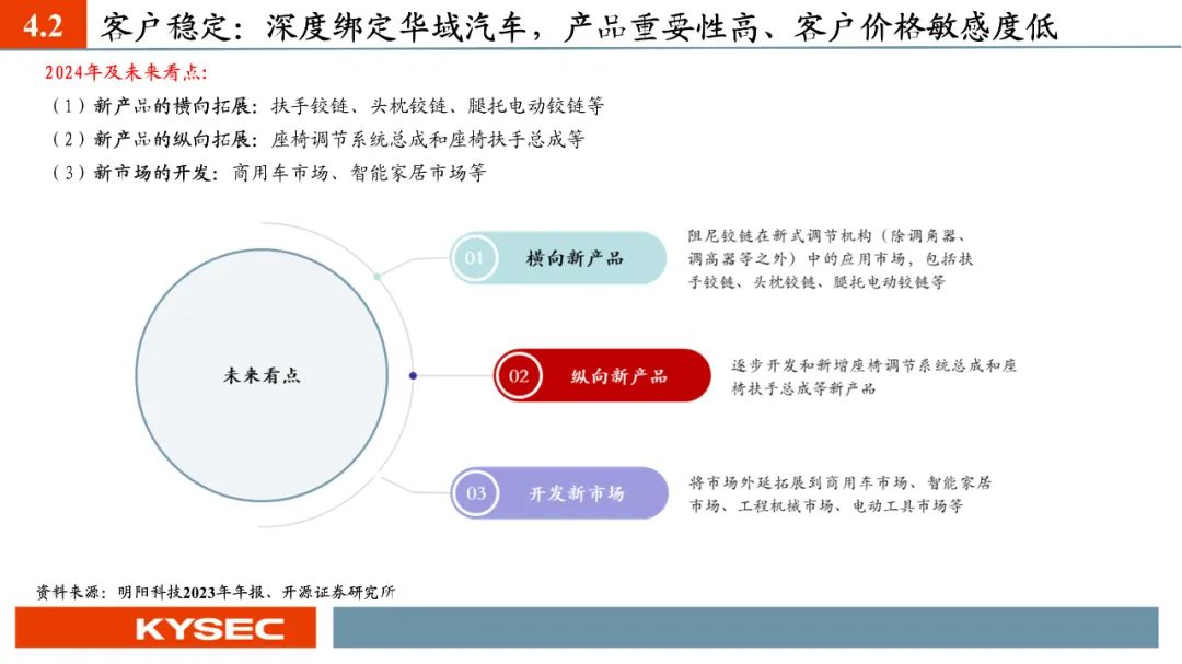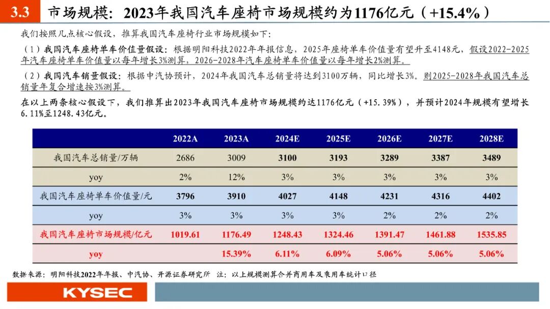 行业发展:华域系为我国汽车座椅龙头(2022年市占率28%),国产替代大势所趋。在汽车座椅轻量化和电动智能化趋势下,汽车座椅单车价值量预期持续提升,我们推算出2023年我国汽车座椅市场规模约达1176亿元(+15.39%),并预计2024年规模有望增长6.11%至1248.43亿元。公司第二成长曲线可从四个维度进行关注:(1)新产品的横向拓展:扶手铰链、头枕铰链、腿托电动铰链等;(2)新产品的纵向拓展:座椅调节系统总成和座椅扶手总成等;(3)新市场的开发:商用车市场、智能家居市场等;(4)募投项目:未来完成实施提供产能保障。