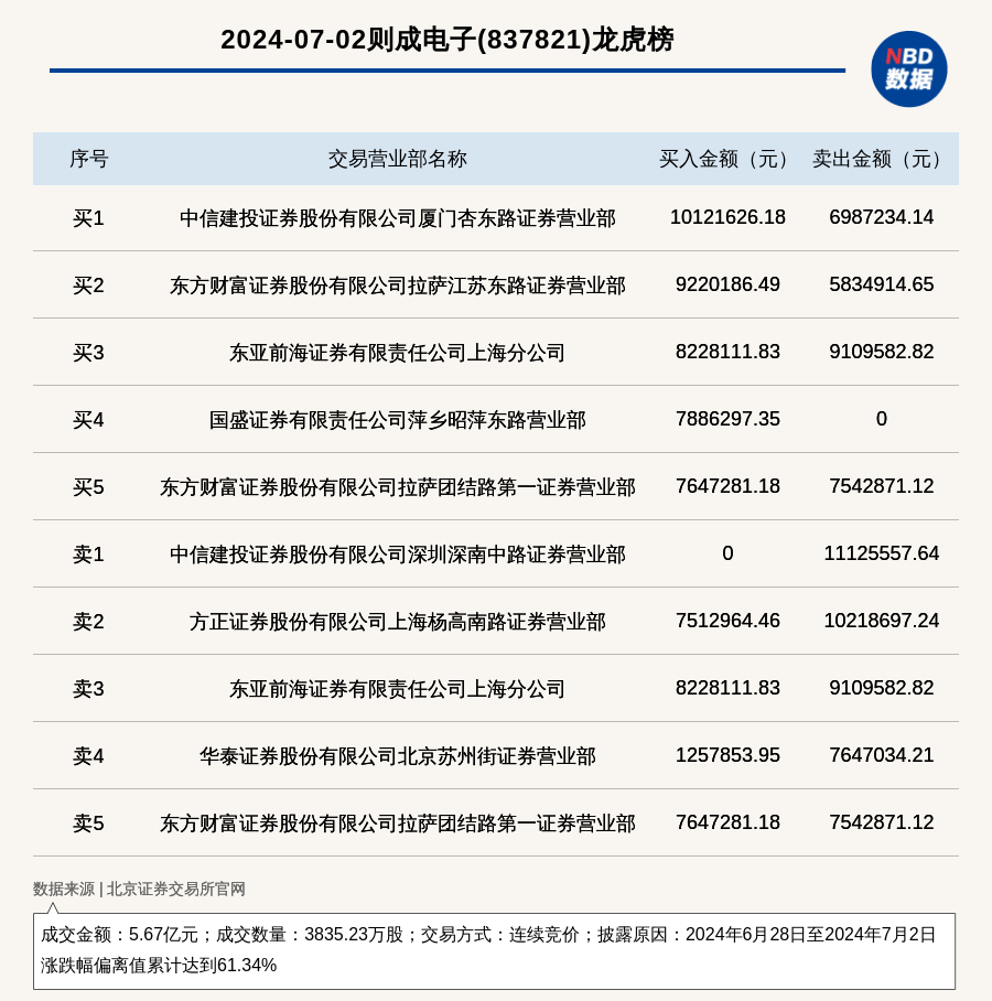 2024年7月2日,北交所上市公司则成电子(837821,收盘价:17.14元)登上龙虎榜,交易方式是连续竞价,披露原因是2024年6月28日至2024年7月2日涨跌幅偏离值累计达到61.34%,成交数量3835.23万股,成交金额5.67亿元。买一席位为中信建投证券股份有限公司厦门杏东路证券营业部,买入1012.16万元;卖一席位为中信建投证券股份有限公司深圳深南中路证券营业部,卖出1112.56万元。