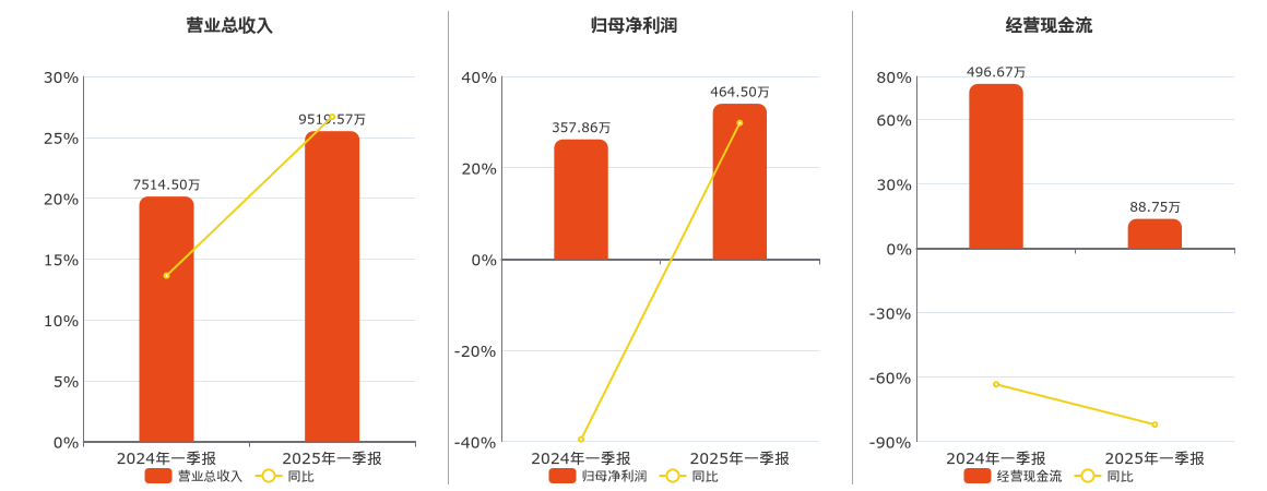 公司营业总收入为9519.57万元。归母净利润为464.50万元。经营活动现金净流入为88.75万元,较去年同报告期经营活动现金净流入减少407.93万元,同比较去年同期下降82.13%。