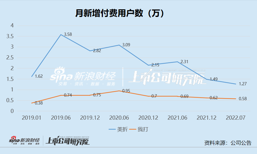 而在衡量SaaS产品的经营数据方面,美折和我打软件的表现均不乐观。基本以半年为节点选取数据来看,月新增付费用户数与月度活跃用户数,美折与我打软件在2019年以来均呈现出先增后减的趋势,当前的水平几乎均与2019年初水平基本持平。